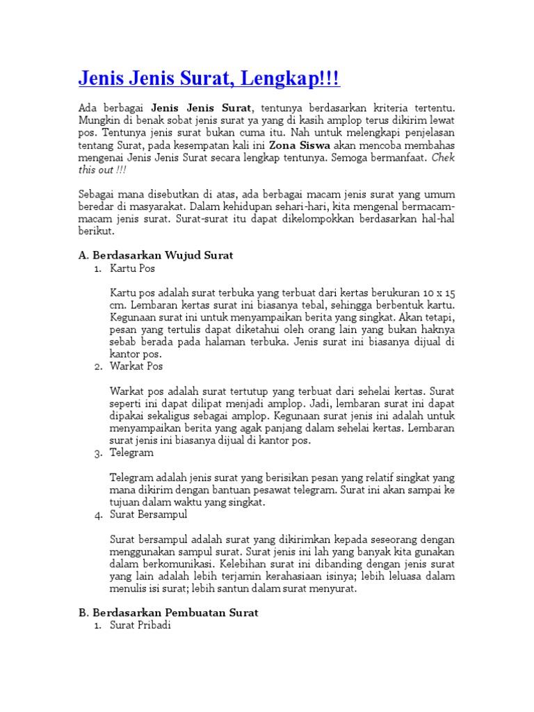 Jenis Jenis Surat from imgv2-2-f.scribdassets.com Ya, saat ini surat memang sudah melekat di kehidupan masyarakat. Surat adalah pesan, informasi ataupun pernyataan yang disampaikan dalam bentuk tertulis dan ditujukan untuk penerimanya. Surat niaga adalah surat yang umumnya digunakan untuk kepentingan bisnis atau perdagangan. Oleh karena itulah, surat niaga juga biasa disebut dengan surat bisnis. Surat tagihan pajak (stp) yaitu salah satu surat untuk dapat melakukan tagihan pajak dan sanksi. Seperti namanya, surat permohonan dimanfaatkan untuk suatu pihak memohon kepada pihak yang menerima surat tersebut. Materi surat lamaran pekerjaan : Segala jenis surat juga dapat.