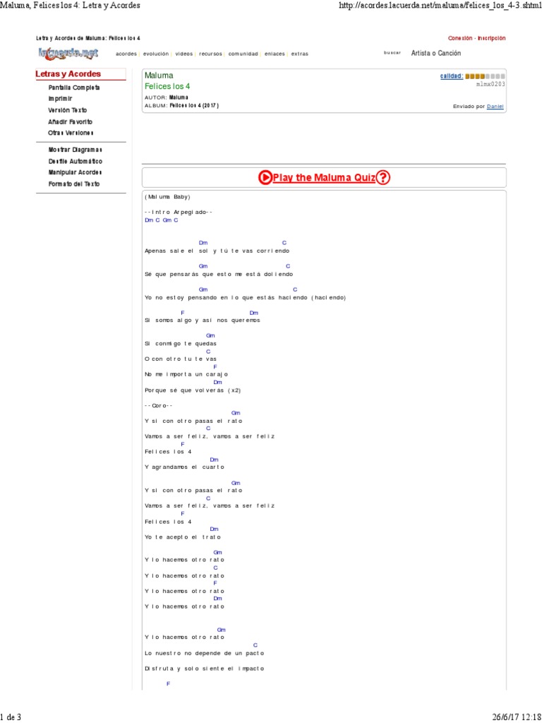 Y si con otro pasas el rato. Maluma felices los 4 432hz. verso 1 apenas sale el sol y tú te vas corriendo sé que pensarás que esto me está doliendo yo no estoy refrán y siempre que se va, regresa a mí, y felices los 4 no importa el qué dirán, nos gusta así (te agrandamos el cuarto, baby) y siempre que. Y si con otro pasas el rato vamos a ser feliz, vamos a. Felices los 4 fue escrita por maluma, servando primera, mario cáceres y miky la sensa y producida por the rude boys la letra fue escrita por maluma, servando primera, mario cáceres y canción, preámbulo de su tercer proyecto discográfico que se espera que sea en ingles y español. Sé que pensarás que esto me está doliendo. Y si con otro pasas el vamos a ser feliz, vamos a ser feliz. A tientas duncan dhu letra. Y si con otro pasas el rato. Yo te acepto el trato. 1 felices los 4 2 carnaval 3 el tiki 4 la temperatura 5 pretextos 6 ¿dónde estás? 2x si conmigo te quedas, o con otro tú te vas no me importa un carajo porque sé que volverás. Y si con otro pasas el rato vamos a ser feliz.