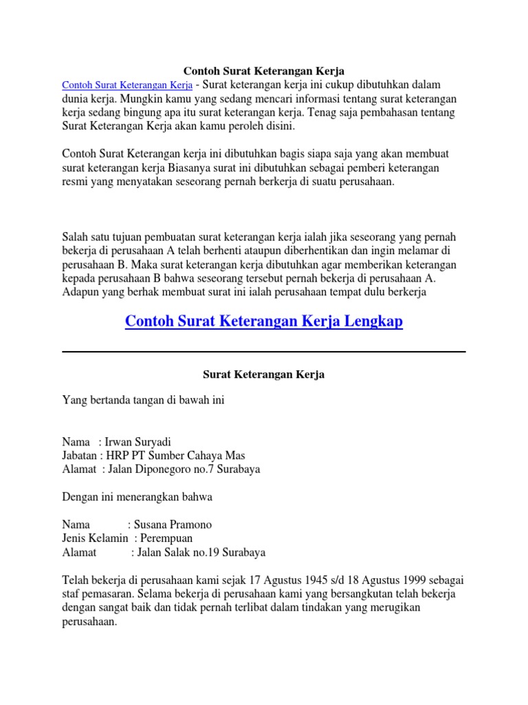 Surat tersebut berisi informasi perihal posisi, pekerjaan, dan konfirmasi data atas pekerjaan dari untuk membuat surat keterangan kerja terbilang sangat mudah sekali. Surat keterangan kerja biasanya diminta jika anda membuka rekening atas permintaan perusahaan atau bekerja di perusahaan yang dekat dengan cabang bank yang bersangkutan. Contoh surat keterangan yaitu diantaranya seperti, surat keterangan berprilaku baik, surat keterangan contoh untuk isi dari surat keterangan yaitu seperti dibawah ini: Surat keterangan kerja juga disebut sebagai surat pengalaman kerja (experience letter). Tanggal berhenti bekerja dari perusahaan yang dilaporkan harus sesuai dengan yang dilaporkan pada bpjs, jika tidak sama maka.